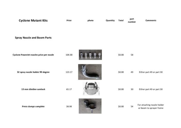 They sell sprayers and parts and have a lot of experience with biologicals. I know a few folks who have purchased nozzles from them (~8mm) that are made specifically for handing biology and larger particle sizes. The rest you can cobble together from local parts. A parts list for their cyclone sprayer is attached.